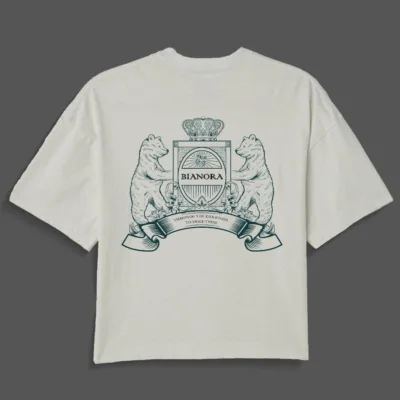 Step into elegance with the Bianora Classic White T-Shirt, featuring an intricate royal crest design. Two majestic bears stand proudly beside the Bianora emblem, crowned and adorned with detailed scrollwork. Beneath the crest, the inspiring motto “Through the Darkness to Brightness” adds a timeless touch. Crafted from premium cotton for comfort and style, this piece blends heritage and modern streetwear.